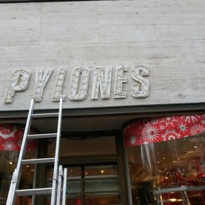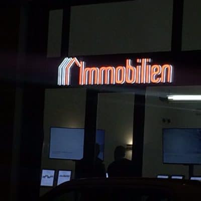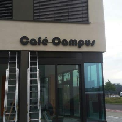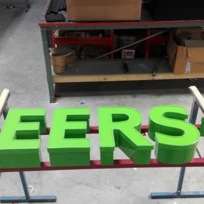 Profil 5 Buchstaben (nach vorne leuchtend) und Formleuchtkasten, nach RAL grün lackiert