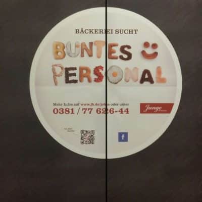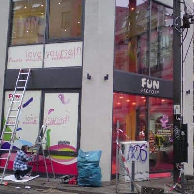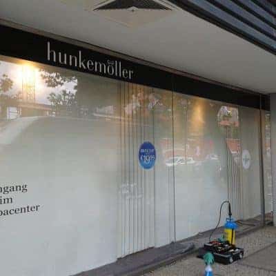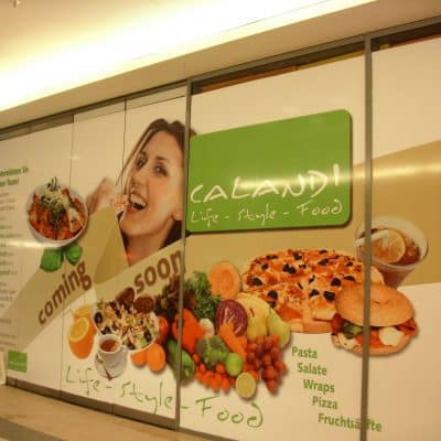 Hier kommt die gesamte Bandbreite der Folienbeklebung zum Einsatz. Die langlebigen Folien für das Branding der Geschäfte – bestehend aus Folienplots, konturgeschnittenen Digitaldrucken und Milchglasfolie – und die kurzlebigen Folien für Sonderaktionen wie Feiertagsdekorationen, Sonderverkäufe etc.